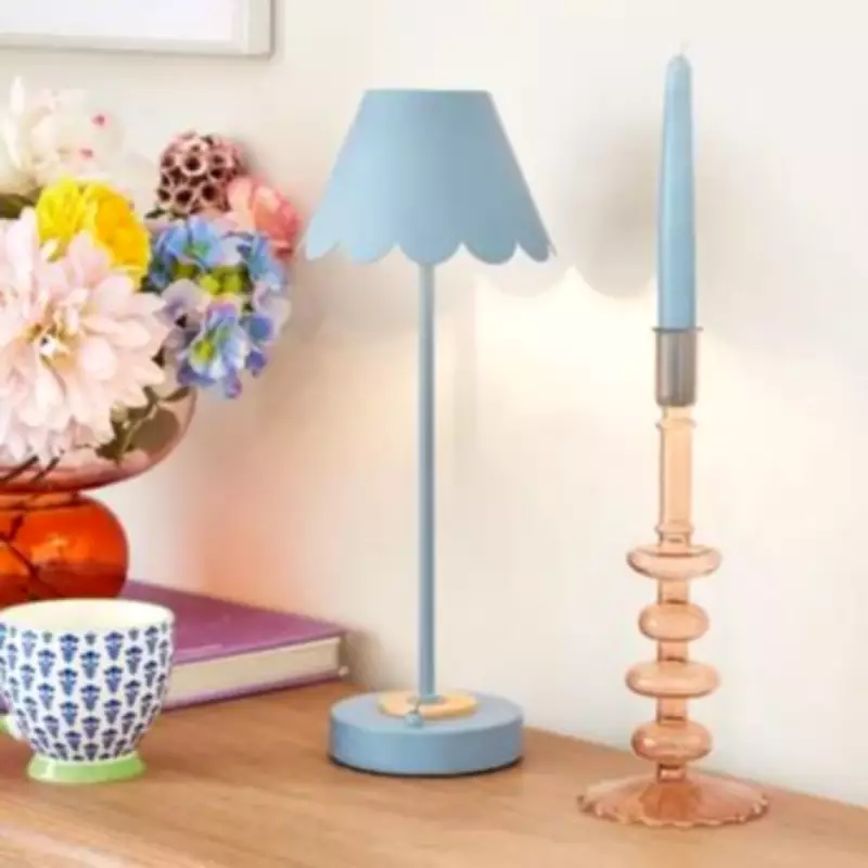 For those seeking alternatives, the Hattie Light Green Rechargeable Scalloped Table Lamp is available at Value Lights for £24.49. This cordless metal lamp also comes with a cable and bulb. Additionally, ASDA offers the Red Striped LED Lamp for £12, which runs on batteries and features a pink and red-striped ceramic base with a scalloped shade.
