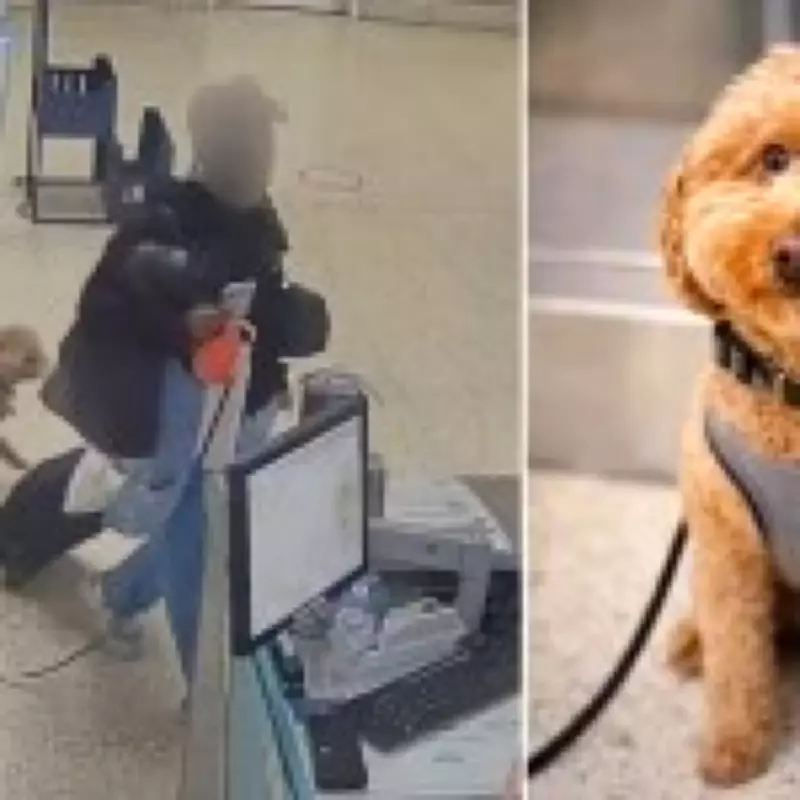 The police department released surveillance footage showing Bryson at the ticket counter with the dog's leash in hand as the puppy excitedly circled around her. After speaking with the attendant, Bryson is seen walking away with her luggage while leaving the dog behind. Airport staff subsequently approached the abandoned animal, with one employee kneeling to pet the dog.